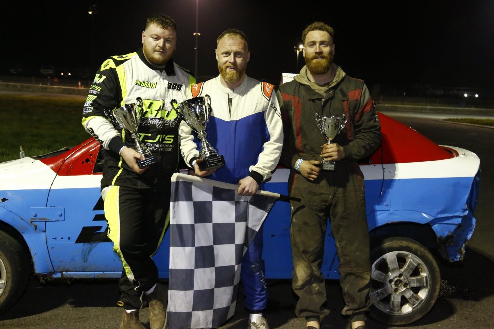 Stevo McGrath powered ahead in the Unlimited National Bangers Irish Championship race, before a puncture slowed his progress and his nephew Deano McGrath came through for the victory ahead of Steven Reynolds and an ailing Stevo.