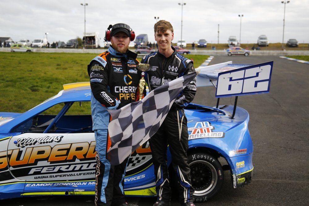 The 1300 Stock Cars Irish Championship will live long in the memory as one of the best races seen on the iconic Aghadowey circuit, a history that dates back over 50 years! Cullybackey’s World Champion Curtis Greer made the perfect break from pole position, only for an early caution period to cancel his advantage. At the resumption the bumpers went in hard and Curtis got shuffled down the order. The lead was changing constantly out front as the bumperwork continued, with so many lead changes it was hard to keep up! Gareth Halliday went ahead, then Graham Meek, then Halliday again and then Curtis McConkey for a few laps. Meek then came back to hit the top spot, before Willie Taggart appeared from the rear of the grid to top spot, with Meek then going back ahead once again. It was sensational stuff, with Meek then tracking Taggart over the last few laps, waiting for a last bend assault. Graham gave it everything, but Taggart was equal to his attack with the Coleraine man staying out front for a superb win over Meek, the recovering Greer, Fionn Donnelly and McConkey.